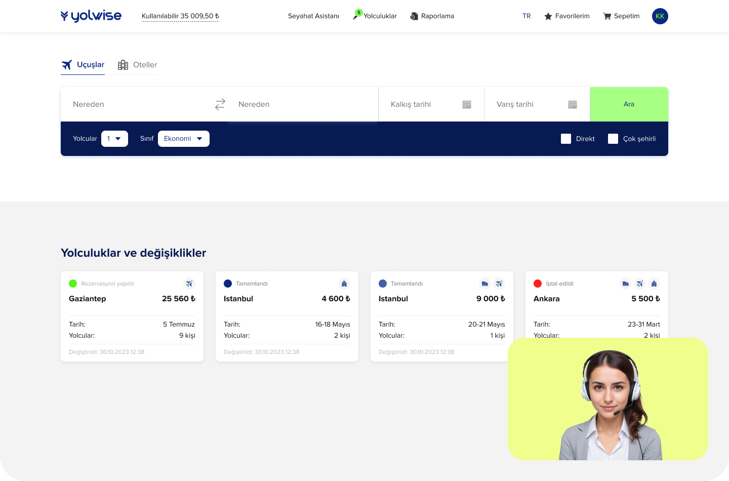 Yolwise, sadece uygun fiyatlı uçak biletleri ve otel rezervasyonları sunmakla kalmayıp, aynı zamanda faturalar, bütçeler, seyahatler ve analizler üzerinde tam kontrol sağlayan kapsamlı bir IT platformudur. Ayrıca, piyasadaki en hızlı müşteri desteğine sahiptir.